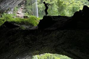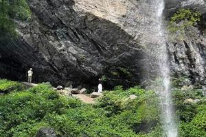 【水滴石穿]:一个小瀑布从高处倾泄而下,正好打到一块岩石中间的孔洞,千万年形成了“水滴
