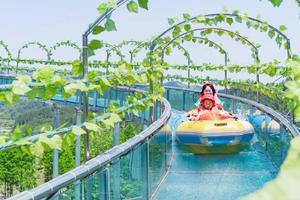 漂流穿越 2 个山林隧道、1 座 600 年古桥——凤仪桥(建于 1623 年), 河道两边绿树成荫,80%绿荫覆盖是天然的大氧吧。漂流起伏缓急各不同,玻 璃漂高空惊险刺激,时而飞跃而下,时而跌宕起伏,时而水仗四起,时而惬 意躺平,漂流下码头有 5 千平方的水域可同时容纳百人共同戏水。