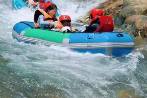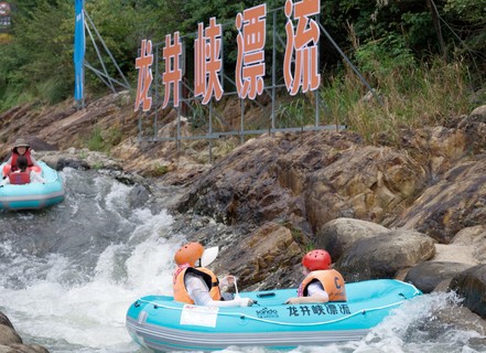 龙井峡激情漂流水流湍急,水纯至清,被誉为“矿泉水上的漂流”,乘筏浪漫奔放,漂流惊险刺激,适宜男女青年嬉水玩耍。漂流四面环山,享受漂流的同时,体验自然环境的美丽与神奇。激情漂流全长3公里,首尾落差128米, 俯冲水坝3-5米不等,漂流全程一个半小时左右。
