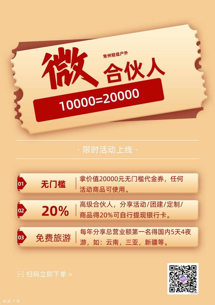 2.成为轻徒“我的微店”小程序高级合伙人,分享活动/团建/定制/商品得20%可自行提现银行卡。